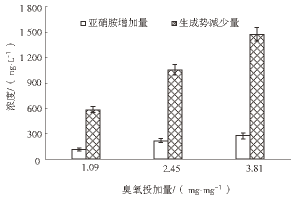 生成勢的測定是在臭氧氧化實驗的基礎(chǔ)上,加入用氯化銨和次氯酸鈉(以Cl2計)按摩爾比1.2∶1配制氯胺溶液,在恒溫(25 ℃)黑暗中儲存10 d,再測定亞硝胺的總量,反應(yīng)前后物質(zhì)的濃度差值即為該物質(zhì)的生成勢。