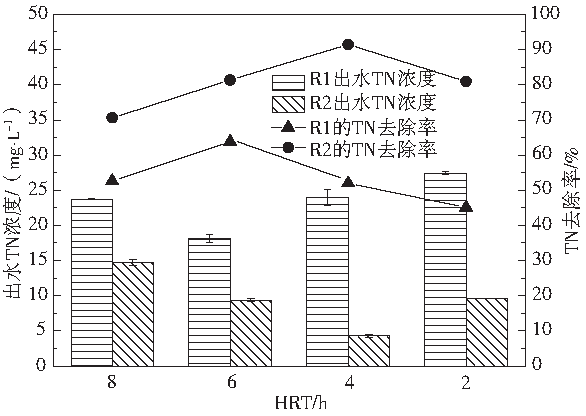 從圖6可見,當HRT從8 h→6 h→4 h→2 h,R1出水TN濃度從23.70 mg·L−1→18.11 mg·L−1→24.01 mg·L−1→27.44 mg·L−1,相應地,TN去除率從52.6%→65.8%→52.0%→45.1%;R2出水TN濃度從14.69 mg·L−1→9.35 mg·L−1→4.28 mg·L−1→9.54 mg·L−1,相應地,TN去除率從70.6%→81.3%→91.4%→80.9%。總的來看,R1和R2出水TN濃度隨HRT變化趨勢是一致的。就R1而言,當HRT為6 h時,TN去除效果最佳。當HRT較長(如8 h)時,在葡萄糖發酵過程中,反硝化菌以外的異養菌會消耗部分碳源,對TN去除不利。而當HRT較短(<6 h),葡萄糖未能完全轉化成易被反硝化菌利用的乙醇,對TN去除也不利。對R2,HRT為4 h時最佳,分析原因,R2以乙酸鈉為碳源,易于被反硝化菌所利用,HRT為4 h可以兼顧硝酸鹽還原和亞硝酸鹽還原過程。苑泉等[18]亦得出了相似的結論。