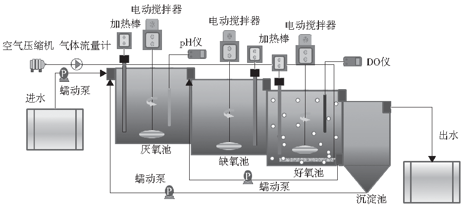 實驗所用裝置由有機玻璃制成,包括3個長方體構造的生物反應池(厭氧池、缺氧池和好氧池)和1個圓錐體構造的沉淀池。厭氧池、缺氧池、好氧池和沉淀池的有效容積分別為7.5、10、20和6 L。各池采用硅膠管連接,前一池的出水通過重力作用溢流至下一池,反應器進水和回流污泥、回流混合液通過蠕動泵(蘭格BT100-2J)控制。好氧池內底部裝有曝氣砂盤,通過空氣壓縮機進行鼓風曝氣,使用轉子流量計(雙環LZB-3WB)調節空氣流速保證DO濃度穩定在(2.5±0.1) mg·L−1范圍內。厭氧池、缺氧池和好氧池設置電動攪拌器和加熱棒,維持反應器內泥水混合均勻、反應溫度在(26±1) ℃范圍內。實驗采用連續進水、連續出水的方式運行。實驗裝置如圖1所示。