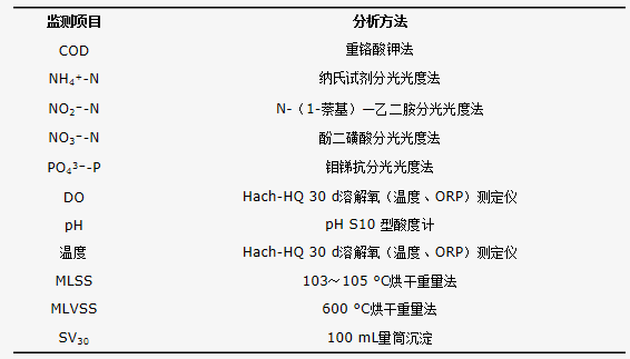 實驗監測項目包括COD、氨氮(NH4+-N)、溶解性磷酸鹽(PO43−-P)、硝酸鹽氮(NO3−-N)、亞硝酸鹽氮(NO2−-N)、溶解氧(DO)、溫度、pH、SV30、混合液懸浮固體濃度(MLSS)和揮發性懸浮固體濃度(MLVSS)?偟(TN)濃度采用氨氮、硝酸鹽氮與亞硝酸鹽氮濃度之和。各監測項目的監測均參考文獻中的方法[11],見表3。