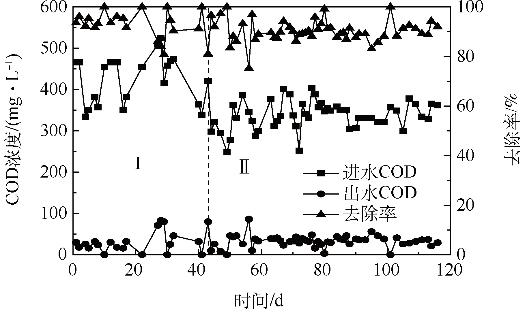 圖2 階段I、階段II COD濃度及其去除率隨時間的變化