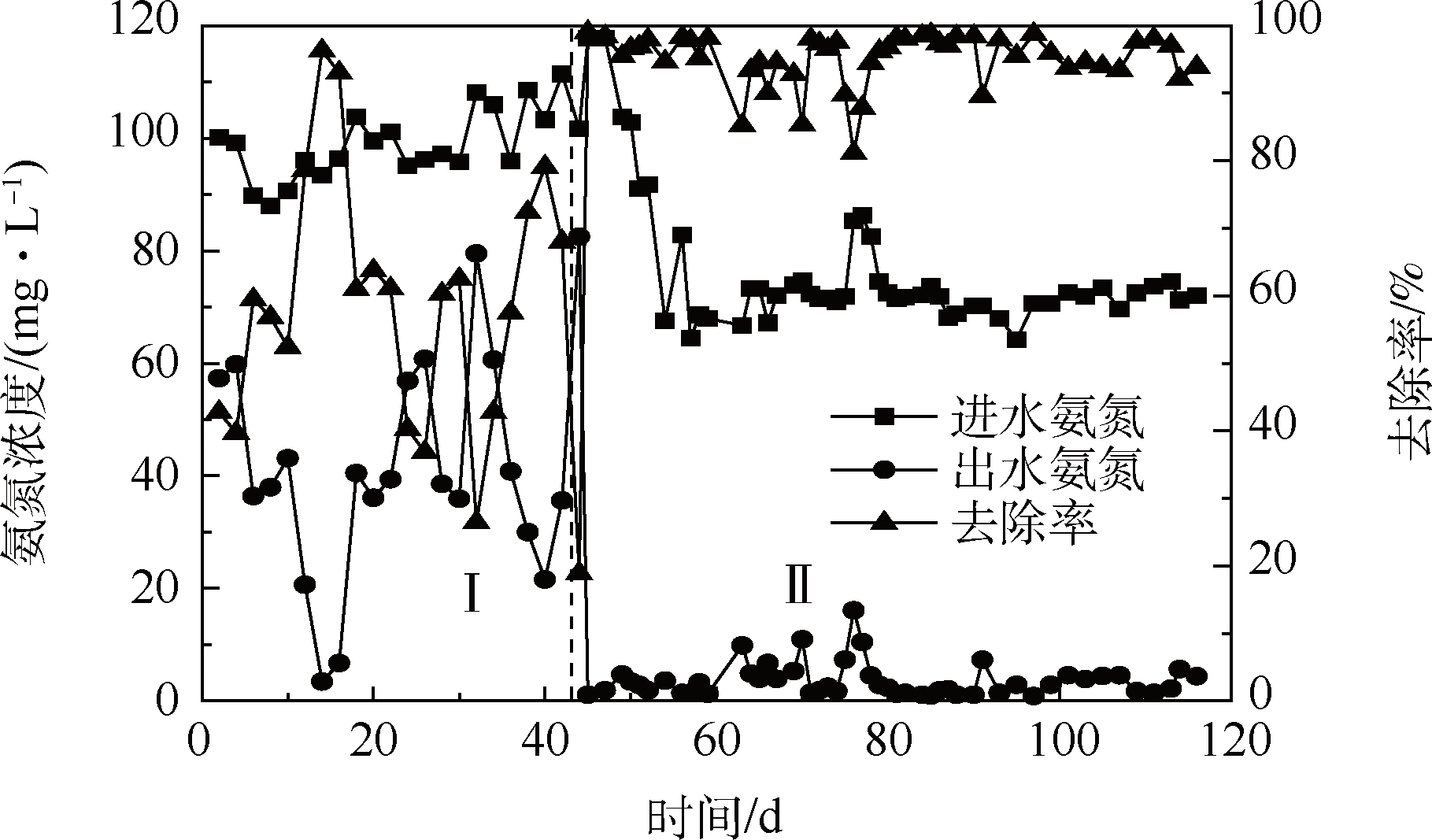圖3 階段I、階段II氨氮濃度及其去除率隨時間的變化