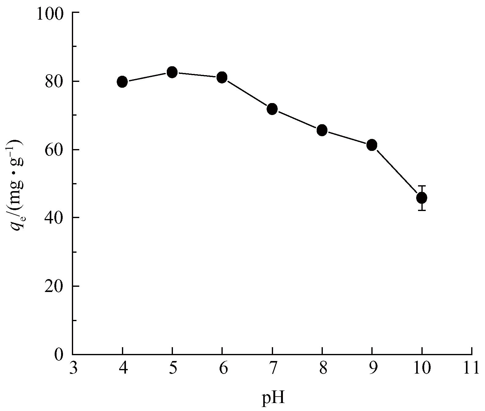 取50 mL初始PO43−濃度為1 mmol·L−1的溶液,用NaOH/HNO3調(diào)節(jié)各反應(yīng)液pH依次為4~10,加入0.015 g吸附劑,T=(25 ± 1) ℃,170 r·min−1條件下避光振蕩24 h后過膜取樣,測定PO43−濃度。
