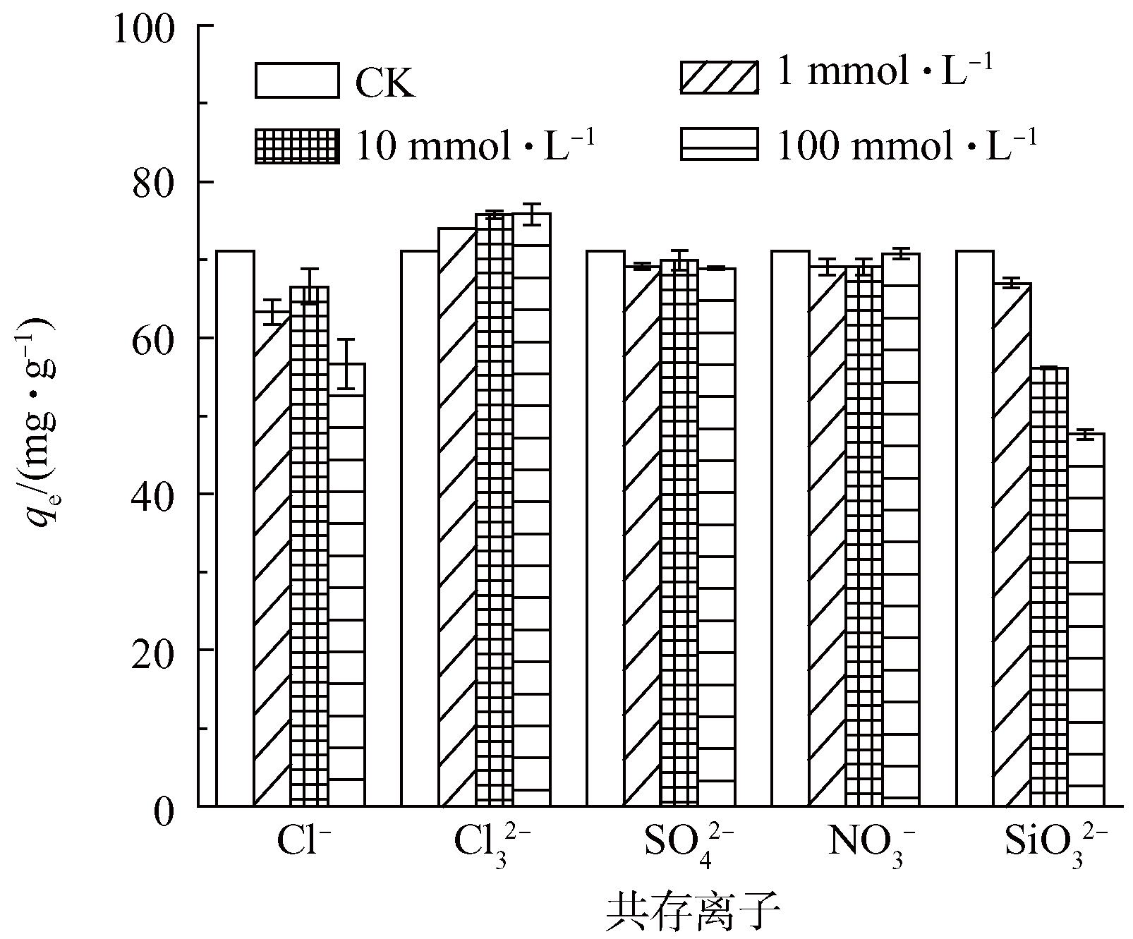 取一系列50 mL初始PO43−濃度為1 mmol·L−1,SO42−、NO3−、SiO32−、CO32−、Cl− 濃度分別為1、10、100 mmol·L−1的溶液,吸附劑投加量為0.3 g·L−1,在pH=7.0 ± 0.1,T=(25 ± 1)℃,170 r·min−1條件下反應(yīng)24 h后取樣,測定PO43−濃度。