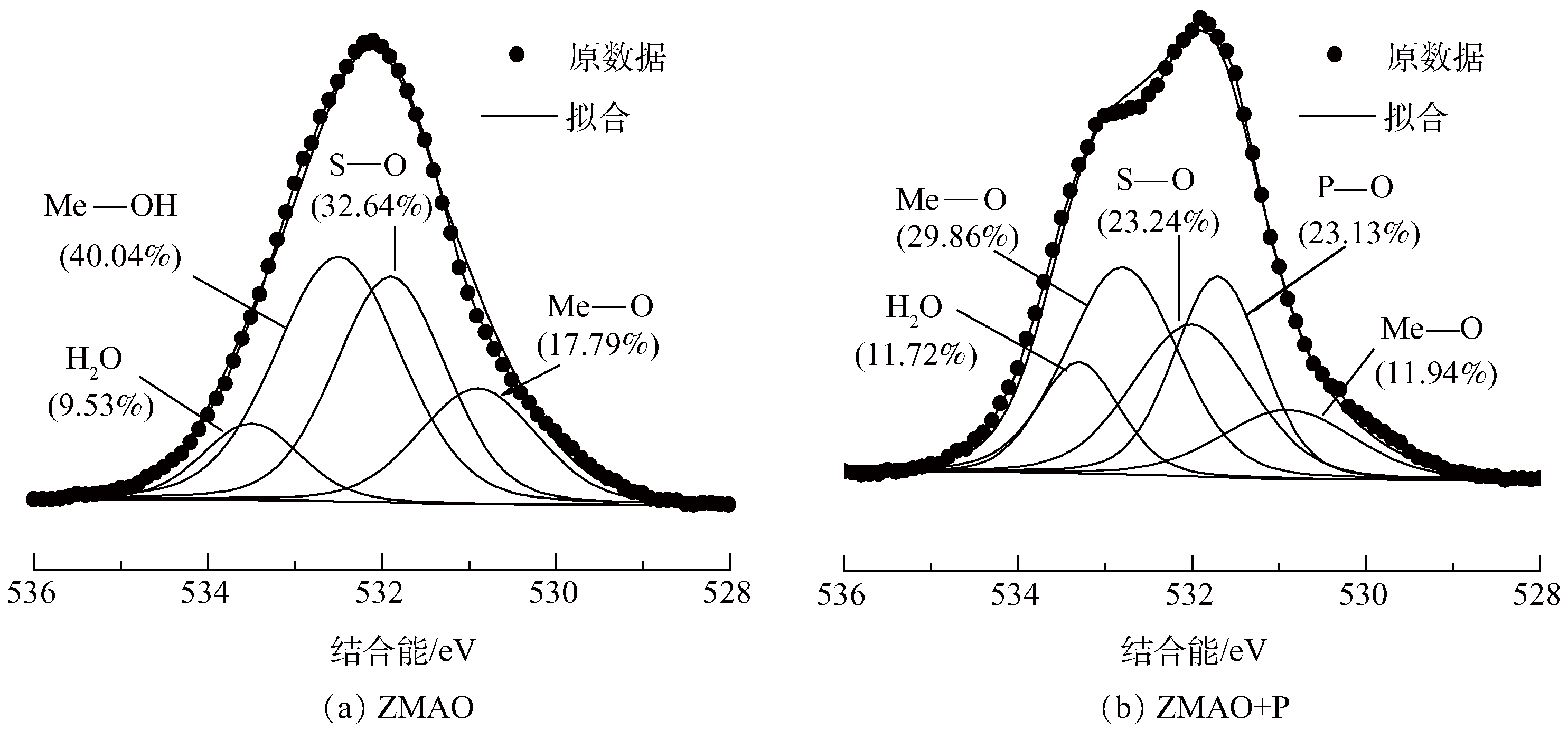 圖8展示的是ZMAO吸附磷前后的O1s特征峰圖譜。吸附前的O1s峰可分為4個小峰(530.9、531.9、532.8和533.5 eV),分別對應(yīng)于晶格氧(Me—O,17.79%)、硫酸根中的氧(S—O,32.64%)、金屬氧化物表面的羥基氧(Me—OH,40.04%)和H2O中的氧(9.53%)。吸附磷后,樣品中Me—OH和S—O的比例分別下降到29.86%和23.24%。同時,在531.7 eV處出現(xiàn)了一個新氧峰,這是磷酸根中的氧(P—O),比例約為23.13%。這說明在吸附劑除磷過程中,吸附劑表面的羥基和硫酸根都發(fā)揮了積極的作用。