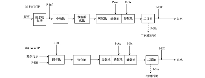 選取浙江省某精細(xì)化工園區(qū)的兩座廢水處理系統(tǒng)為研究對象, 它們分別是藥業(yè)集團(tuán)的廢水處理系統(tǒng)(PWWTP)和園區(qū)綜合性廢水處理系統(tǒng)(IWWTP).該藥業(yè)集團(tuán)是化學(xué)合成醫(yī)藥原料和獸藥原料的生產(chǎn)商, 主導(dǎo)產(chǎn)品為喹諾酮類抗菌藥、大環(huán)內(nèi)酯類抗菌藥等抗生素類藥物, 其中鹽酸環(huán)丙沙星、恩諾沙星、阿奇霉素、克拉霉素、羅紅霉素等產(chǎn)品在全球市場上占據(jù)優(yōu)勢地位.該公司產(chǎn)生的廢水是典型的制藥廢水, 有機(jī)污染物濃度高(COD可達(dá)5000 mg ·L-1), 水質(zhì)波動大, 可生化性較差.該公司的廢水處理系統(tǒng)采用A2O工藝, 設(shè)計處理能力為2400 m3 ·d-1, 實際處理水量約為1000 m3 ·d-1.制藥廢水經(jīng)處理后排入園區(qū)下水道, 與園區(qū)其它工業(yè)廢水及周邊生活污水混合(工業(yè)廢水和生活污水的比例約為6 :4), 再進(jìn)入園區(qū)綜合性廢水處理系統(tǒng), 該處理系統(tǒng)主體工藝為氧化溝, 分厭氧段、缺氧段和好氧段運行, 設(shè)計處理能力為22.5萬m3 ·d-1, 目前實際處理水量約為11.5萬m3 ·d-1, 處理后出水排入臨近海域.