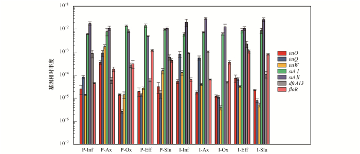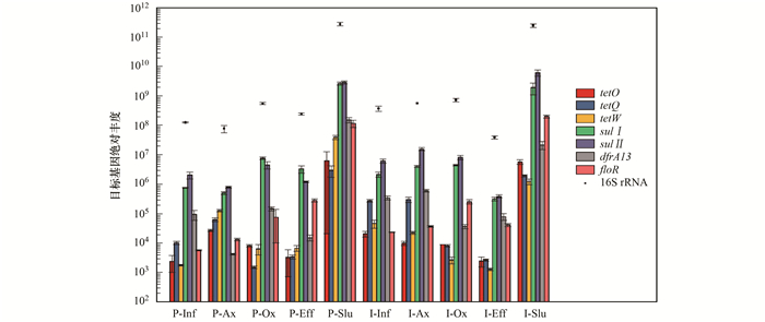 圖 3 廢水處理系統(tǒng)水樣中16S rRNA與總ARGs相關(guān)性有研究指出在PWWTP中, 相比于抗生素濃度, 微生物濃度是影響ARGs的更為重要的因素.在兩座廢水處理系統(tǒng)的進(jìn)水中, ARGs濃度在1.79×103 copies ·mL-1(tetW, P-Inf)~6.14×103 copies ·mL-1(sul Ⅱ , I-Inf)之間, 其中, sul Ⅰ 和sul Ⅱ 基因絕對豐度最高, 隨后依次是dfrA 13 、tetQ、floR、tetO和tetW基因.兩座系統(tǒng)進(jìn)水中ARGs相對豐度的分布順序與絕對豐度一致(圖 4), 仍舊是sul Ⅰ 和sul Ⅱ 基因最高, 隨后依次是dfrA 13 、tetQ、floR、tetO和tetW基因.有研究顯示, sul Ⅰ 和sul Ⅱ 基因以105~107 copies ·mL-1的絕對豐度存在于不同的市政污水處理系統(tǒng)的進(jìn)水中, 濃度水平高于四環(huán)素類ARGs[25, 29, 30], 在制藥廢水處理系統(tǒng)中也有同樣的情況, 這與本研究的結(jié)果一致.四環(huán)素類ARGs中, tetO、tetQ和tetW基因在廢水處理系統(tǒng)中的分布較早地得到了關(guān)注, 在制藥廢水處理系統(tǒng)中也有研究.本研究對這3種四環(huán)素類ARGs的相關(guān)性分析顯示, tetO基因與tetW基因顯著正相關(guān)(P < 0.01, r=0.915), 而tetQ基因與tetO(P=0.27, r=0.442)、tetW(P=0.56, r=0.246)基因正相關(guān)但不顯著, 說明這3種四環(huán)素類ARGs在兩級廢水處理系統(tǒng)中的濃度水平具備相似性, 這可能與它們具備相同的抗性機(jī)制有關(guān).與四環(huán)素類和磺胺類ARGs不同, 甲氧芐啶抗性基因dfrA 13 尚未有文獻(xiàn)報道存在于污水處理系統(tǒng)中.在本研究中, dfrA 13 的絕對豐度水平高于已有研究中檢出頻率較高的3種四環(huán)素類ARGs, 這表明僅著眼于四環(huán)素類和磺胺類ARGs等高頻率被檢出的ARGs類別, 對廢水處理系統(tǒng)中ARGs污染狀況的評估將是不全面的, 未來建議引入高通量qPCR、宏基因組等新技術(shù)進(jìn)行更加細(xì)致全面的研究.