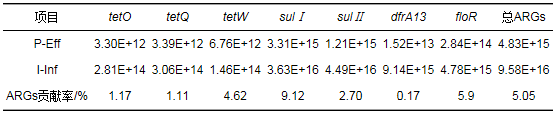 (3) 制藥廢水處理系統(tǒng)出水僅占園區(qū)綜合性廢水處理系統(tǒng)總水量的0.87%, 而總ARGs的貢獻(xiàn)率為5.05%, 傳播輸出最高的3種ARGs為sul Ⅰ 、floR和tetW基因.