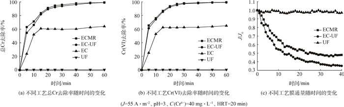 實驗對比研究了電絮凝-膜分離反應器(electrocoagulation membrane reactor, ECMR)、電絮凝-超濾(electrocoagulation-ultrafiltration, EC-UF)、電絮凝(electrocoagulation, EC)和超濾(ultrafiltration, UF)工藝的除鉻效果。從圖 2(a)、(b)中可以看出,ECMR和EC-UF工藝在25 min之后對總Cr和Cr(Ⅵ)的去除率便可達到90%左右,在50 min后的總Cr和Cr(Ⅵ)去除率可達到99.2%左右。對于初始濃度為40 mg·L-1的含鉻廢水經ECMR處理后出水達到污水綜合排放標準。對于EC工藝,總Cr和Cr(Ⅵ)的去除率在15 min之后基本不變,穩定在60%左右,UF幾乎無法截留水中的Cr(Ⅵ)。