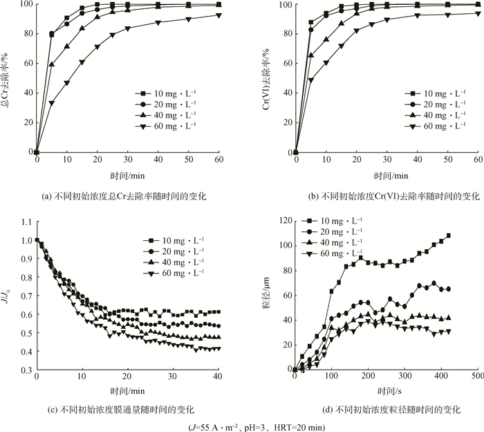 分別考察了初始濃度為10、20、40、60 mg·L-1時ECMR除鉻效能和膜通量變化情況。由圖 6(a)、(b)可知,當初始濃度為60 mg·L-1,60 min時總Cr和Cr(Ⅵ)的去除率分別達92.6%和93.8%。當初始濃度≤40 mg·L-1,總Cr和Cr(Ⅵ)的去除率在60 min時幾乎可以達到100%。由圖 6(c)可知隨著初始濃度的增大,膜通量逐漸降低。從圖 6(d)發現,隨著初始濃度的增大,絮體粒徑增長速率逐漸減慢,在膜表面形成濾餅層的時間更長,在濾餅層形成之前會造成嚴重膜孔堵塞,導致通量下降,膜污染加劇。
