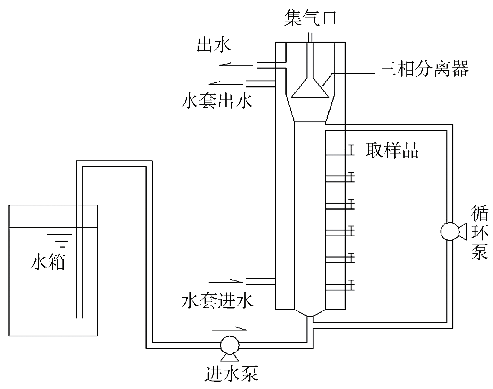 實驗裝置見圖1,UASB反應器材質為有機玻璃,整體高度60 cm,其中反應區高度35 cm,內徑6 cm,有效容積約1 L。內徑外側為可溫控水套,溫度控制為35 ℃。反應器外壁自下而上設置6個取樣口,取樣口的內徑是10 mm。反應區上部設置回流管,回流液可經過循環泵重新進入反應器。進水由蠕動泵從反應器底部進入。