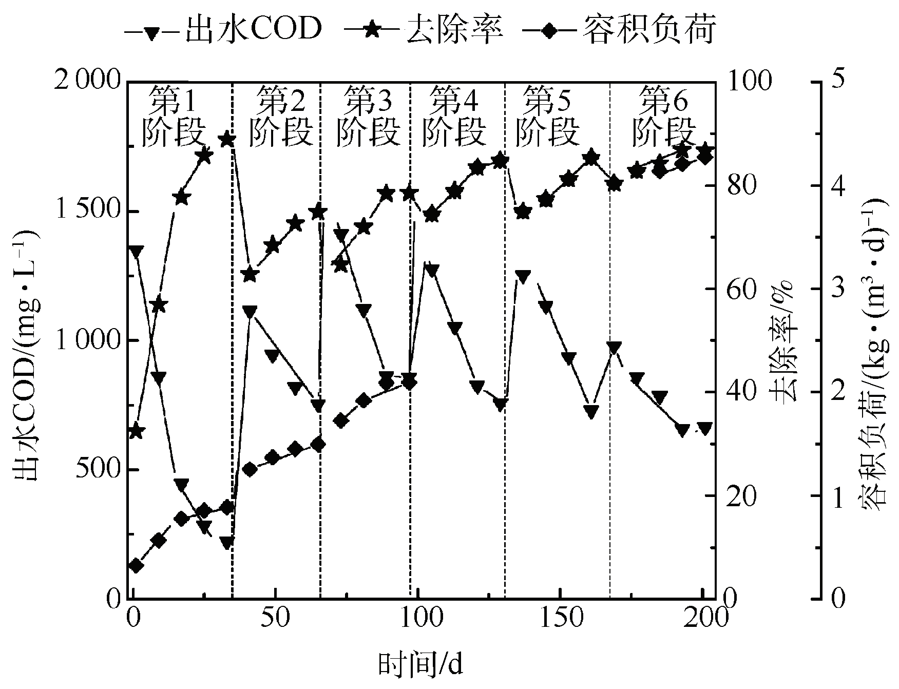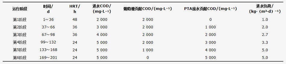 由于低負荷啟動可減少反應器的污泥損失,降低抑制性物質的積累,因此本實驗采用低負荷啟動。在反應器啟動過程中,采用逐漸提高進水負荷和減少HRT的運行方法進行。為快速提高接種污泥活性,第1階段用葡萄糖代替模擬PTA廢水作為碳源。隨后往葡萄糖配水中逐漸加入PTA廢水提高配水COD值,直至成分完全為PTA廢水。啟動過程按照PTA廢水的比例分為6個階段,見表2。在反應器進入下一個階段之前,出水各項指標值達到穩定。在啟動初期,通過內回流將進水流速提高至0.5 m·h−1,增加進水和底部污泥充分接觸,去除系統中細小和老化污泥。當系統內產氣量逐漸增多,可實現液體在反應器內部擾動,優化混合效果,此時逐漸減小回流量。