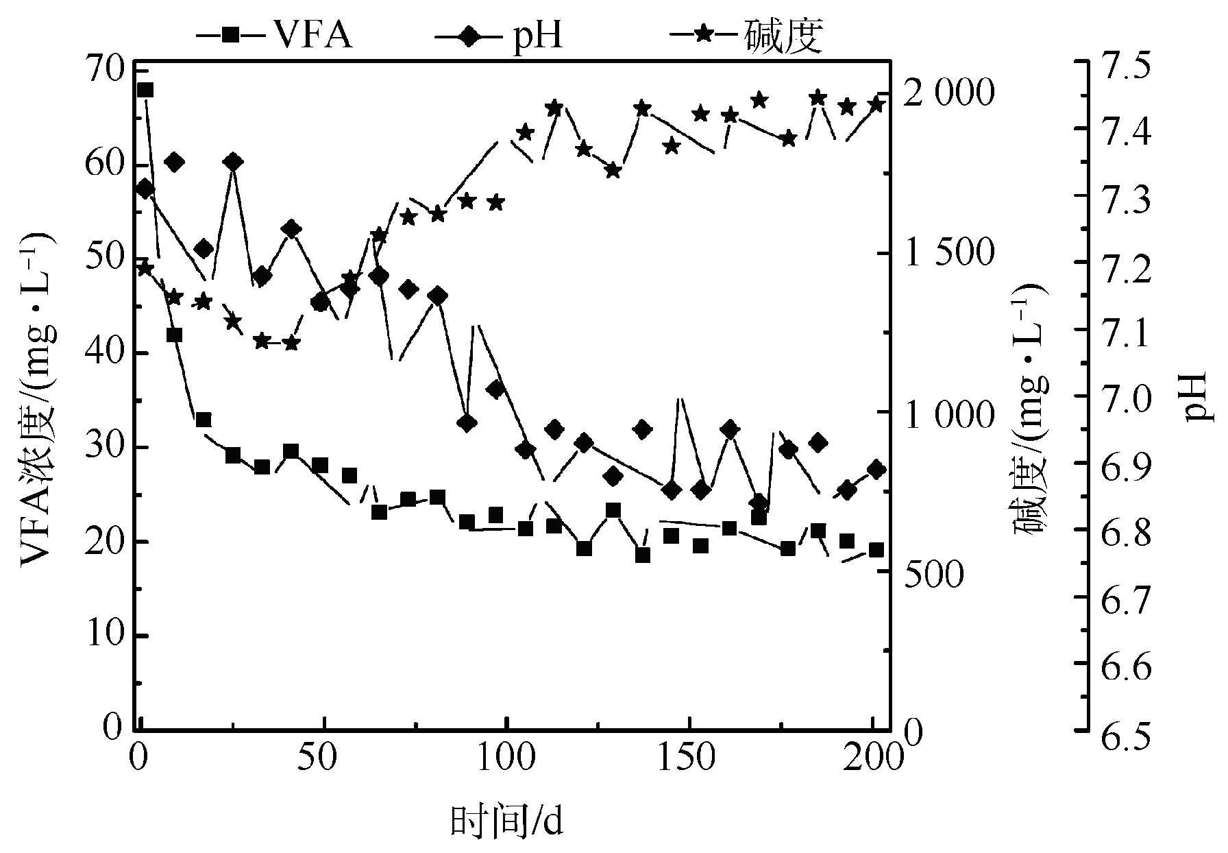 VFA是厭氧消化過程的重要中間產物之一,產甲烷菌以VFA為底物,在生長代謝過程中產生甲烷。pH和堿度也是重要的工程控制參數,影響微生物群落結構與代謝活性。出水VFA、pH和堿度隨時間的變化見圖5。反應器在啟動初期,出水VFA較高,最高濃度達到68.3 mg·L−1,之后逐漸降低。盡管進水負荷逐漸增加,但是出水VFA濃度在60 d之后并未出現較大變化,出水VFA濃度逐漸趨于穩定,說明產甲烷菌數量增多或活性逐漸增強,反應器未發生酸化現象。在啟動實驗結束后,對出水VFA組分進行了檢測,主要成分為乙酸,占90%以上,其余為丙酸和丁酸等。通過pH變化曲線,可以看出隨著進水負荷的增加,出水pH呈逐漸降低趨勢。但是出水pH一直處在6.7~7.5之間,并未發生太大波動,這是由于原水中堿度在1 500 mg·L−1左右,水質本身具有較強的抗酸化能力。出水堿度在啟動初期低于進水,說明此時反應器內以酸化反應為主。隨著培養的進行,產甲烷反應開始出現,出水堿度增加,最后穩定在2 000 mg L−1左右,屬于1 000~5 000 mg L−1的正常范圍以內。