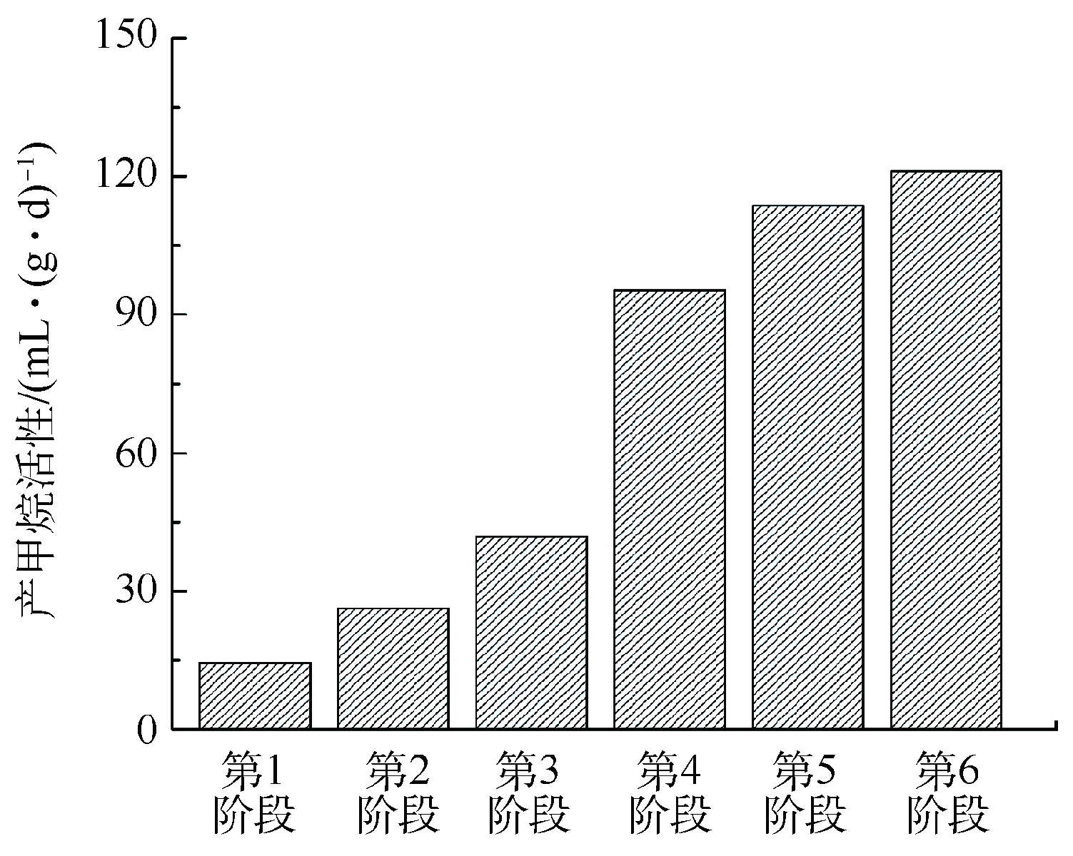 污泥的產甲烷活性是厭氧污泥的重要生理指標,反映污泥的產甲烷潛力。在不同階段穩定期內,污泥比產甲烷活性見圖7。在第1階段,進水負荷較低,污泥處在馴化期,此時產甲烷活性也較低,只有14.4 mL·(g·d)−1。隨著污泥繼續馴化,進水負荷持續升高,產甲烷活性在第2階段達到了26.3 mL·(g·d)−1。隨著顆粒污泥的出現,在第3階段,產甲烷活性增加到41.8 mL·(g·d)−1。在第4階段和第5階段,顆粒污泥進入快速生長期,產甲烷活性也呈現對數增長。到了第5階段末期,產甲烷活性增加到113.7 mL·(g·d)−1。在第6階段末期,產甲烷活性最終穩定在121.2 mL·(g·d)−1,相比上一階段,產甲烷活性變化幅度較小,說明顆粒污泥已經進入生長的穩定期,產甲烷活性已經達到最大。