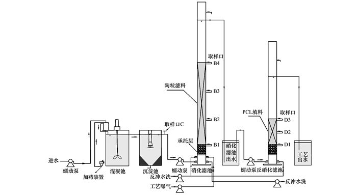 CS-BAF-SPDB主要由混凝沉淀池, 硝化濾池和固相反硝化濾池組成, 濾池主體采用有機玻璃制作, 其結(jié)構(gòu)如圖 1所示.其中混凝池和沉淀池的體積均為10 L; 曝氣生物濾池的濾柱高度為175 cm, 內(nèi)徑為8 cm, 濾柱內(nèi)填充的濾料為黏土陶粒, 填充高度為87 cm, 從承托層頂部到填料頂部共設(shè)4個取樣口(B1、B2、B3和B4);固相反硝化濾池的濾柱高度為130 cm, 內(nèi)徑為8 cm, 濾柱內(nèi)填充的濾料為聚己內(nèi)酯顆粒, 填充的高度為27 cm, 從承托層頂部到填料頂部共設(shè)3個取樣口(D1、D2和D3).曝氣生物濾池和固相反硝化濾池的有效體積(液體體積)分別為4.0 L和3.2 L.工藝進水流量通過蠕動泵(BT-1002J)控制.曝氣生物濾池由空壓機供氣, 進氣量通過氣體流量計和閥門控制.溫度控制儀嚴格控制進水水溫和濾池內(nèi)的溫度.
