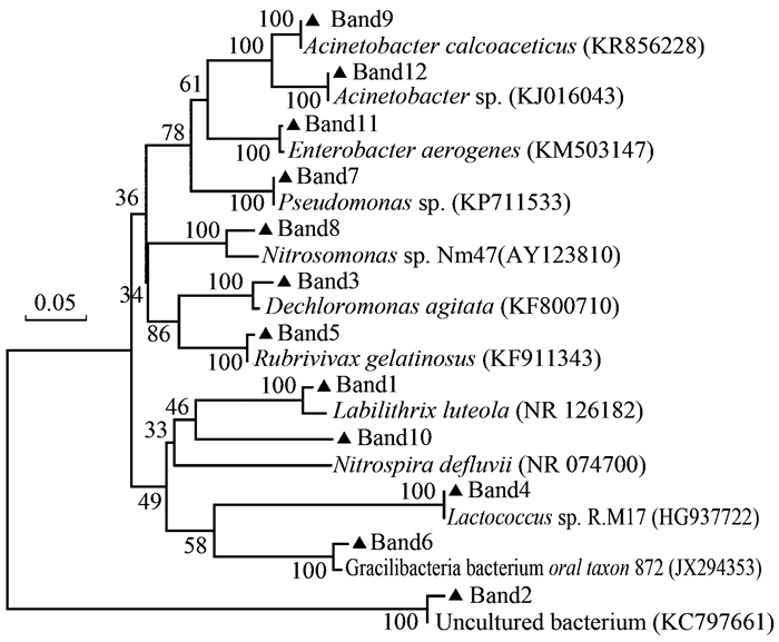 圖 5 基于16S rDNA序列的固相反硝化濾池生物膜中主要菌落的系統(tǒng)發(fā)育樹從表 2和圖 4可以看出, 條帶8和10對應(yīng)的菌株分別與Nitrosomonas sp. Nm47和Candidatus Nitrospira defluvii最相似. Nitrosomonas sp. Nm47和Candidatus Nitrospira defluvii分別是廢水生物處理系統(tǒng)中重要的氨氧化菌和亞硝酸鹽氧化菌.因此, Nitrosomonas sp. Nm47和Candidatus Nitrospira defluvii是硝化濾池中主要的硝化細菌.當(dāng)氣水比從6 :1降低到4 :1后, 代表這兩種微生物菌屬的條帶沒有發(fā)生明顯的變化, 說明氣水比在一定范圍內(nèi)的降低不會對硝化細菌的組成和數(shù)量造成顯著的影響.相應(yīng)地, 當(dāng)氣水比從6 :1降低到4 :1后, 硝化濾池硝化效果變化不大, 始終保持較高的氨氮去除率(圖 2).但是當(dāng)氣水比從4 :1進一步降低到2 :1后, 代表這兩種微生物菌屬的條帶信號亮度出現(xiàn)了明顯的降低, 說明氨氧化菌和亞硝酸鹽氧化菌的數(shù)量出現(xiàn)了明顯的下降.相應(yīng)地, 當(dāng)氣水比從4 :1降低到2 :1后, 硝化作用受到明顯的抑制, 氨氮去除率明顯下降(圖 2).造成這種現(xiàn)象的原因可能在于, 硝化濾池在低溶解氧條件下, 缺氧環(huán)境可能在生物膜中形成, 使得硝化細菌的生長和活性受到一定程度的影響.綜上所述, 氣水比降低后導(dǎo)致的氨氧化菌和硝酸鹽氧化菌數(shù)量及活性的下降是導(dǎo)致硝化效果惡化的直接原因.條帶9和12對應(yīng)的菌株與Acinetobacter calcoaceticus和Acinetobacter sp.的相似性均達到了100%. Acinetobacter calcoaceticus與Acinetobacter sp.是生物膜中比較常見的異養(yǎng)硝化菌, 可以利用進水中的有機物進行硝化作用.在氣水比為6 :1時, 這兩種微生物的數(shù)量較低, 而當(dāng)氣水比降低到4 :1后, 這兩種微生物逐漸發(fā)展成為優(yōu)勢菌.氣水比的降低減少了異養(yǎng)好氧菌對有機物的消耗, 使得有機物濃度有所上升, 有利于異養(yǎng)硝化菌的生長, 同時異養(yǎng)硝化菌的硝化過程幾乎不受溶解氧濃度的影響.當(dāng)氣水比從6 :1降低到4 :1的過程中, 雖然硝化細菌的數(shù)量和活性未發(fā)生明顯的變化, 但是氣水比的降低會影響溶解氧在生物膜中的傳遞速率, 然而硝化效果并未受到明顯影響, 說明異養(yǎng)硝化菌這類優(yōu)勢菌的形成彌補了溶解氧對硝化的影響.條帶7和11對應(yīng)的菌株分別與Pseudomonas sp.和Enterobacter aerogenes最接近. 其中前者為厭氧發(fā)酵過程中常見的厭氧產(chǎn)氫菌, 而后者為典型的兼性厭氧菌.這兩種菌落的富集也進一步證實了氣水比的降低對溶解氧在生物膜中的傳遞產(chǎn)生了不利的影響.