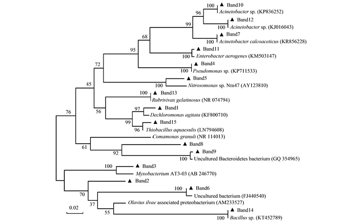 表 3和圖 5所示分別為固相反硝化濾池DGGE凝膠條帶回收序列分析結(jié)果及主要菌落的系統(tǒng)發(fā)育樹.從中可以看出, 條帶1、3、8和13對應(yīng)的菌株分別為Dechloromonas agitata、Myxobacterium AT3-03、Comamonas granuli和Rubrivivax gelatinosus. Ginige等的研究表明, Dechloromonas是以甲醇作為碳源馴化的活性污泥中的主要反硝化菌. Manucharova等的研究發(fā)現(xiàn), Myxobacteria可以以固體碳源(草生灰化石)作為唯一碳源進行反硝化, 并且該菌株在草生灰化石中是最活躍的反硝化菌, 表現(xiàn)出最強的反硝化活性. Comamonas granuli菌株屬于叢毛單胞菌科, 具有將硝態(tài)氮還原成亞硝態(tài)氮的能力; Rubrivivax gelatinosus可以將亞硝態(tài)氮還原為氮氣, 但是不能以硝態(tài)氮作為電子受體.上述條帶對應(yīng)的反硝化菌群是固相反硝化濾池中的優(yōu)勢菌群, 且在3個氣水比條件下的泳道中都存在, 表明氣水比的變化對固相反硝化濾池中的優(yōu)勢菌反硝化菌的影響較小.當(dāng)氣水比降低到2 :1時, 上述條帶代表的微生物的數(shù)量出現(xiàn)了較明顯的增加, 說明在低氣水比條件下, 硝化濾池中出水?dāng)y帶進入固相反硝化濾池的溶解氧濃度低, 在固相反硝化濾池中營造了良好的缺氧環(huán)境, 有利于反硝化菌的生長和繁殖.條帶5與菌株Nitrosomonas sp. Nm47最接近.從前面的分析已知, Nitrosomonas sp. Nm47是典型的氨氧化菌.該菌在固相反硝化濾池生物膜中的出現(xiàn), 表明表層生物膜存在一定濃度的溶解氧.造成這種情況的原因可能在于, 在氣水比較高的情況下, 硝化濾池未被完全利用的溶解氧隨出水進入到固相反硝化濾池中, 而反硝化濾池底部固相碳源材料在微生物降解作用下釋放的有機碳源在好氧微生物的呼吸作用下消耗的溶解氧有限, 部分未被消耗的溶解氧進入濾池中部填料表面的生物膜.當(dāng)氣水比降低到4 :1, 條帶5消失了, 說明硝化濾池出水中的溶解氧濃度較低, 且在固相反硝化濾池底部就被消耗掉了, 可以保持較好的缺氧環(huán)境.對比不同氣水比條件下固相反硝化濾池的反硝化效果的研究(圖 2)結(jié)果也證實了這一點.當(dāng)氣水比為6 :1時, 固相反硝化濾池出水的硝態(tài)氮濃度波動較大, 表明反硝化受到硝化濾池出水中溶解氧的影響.但是, 當(dāng)氣水比為4 :1時, 出水中的硝態(tài)氮則一直維持在較低的水平.條帶4對應(yīng)的菌株為Pseudomonas sp..付曉的研究發(fā)現(xiàn)Pseudomonas sp.可以通過分泌PCL解聚酶將PCL分解為PCL單體和二聚體, 而據(jù)Honda等的研究發(fā)現(xiàn), 反硝化菌可直接利用PCL的單體和二聚體作為電子供體進行反硝化.此外, Pseudomonas sp.還是一種好氧反硝化菌, 在有溶解氧存在的條件下可以利用氧氣作為電子受體進行反硝化作用.條帶12、14和15對應(yīng)的菌株分別是Acinetobacter sp.、Bacillus sp.和Thiobacillus aquaesulis, 這些菌株均屬于好氧反硝化菌. Acinetobacter sp.受氣水比的影響較小, 而Bacillus sp.和Thiobacillus aquaesulis則隨著氣水比的降低逐漸成為優(yōu)勢菌株.說明氣水比的降低有利于固相反硝化濾池中好氧反硝化菌的富集.