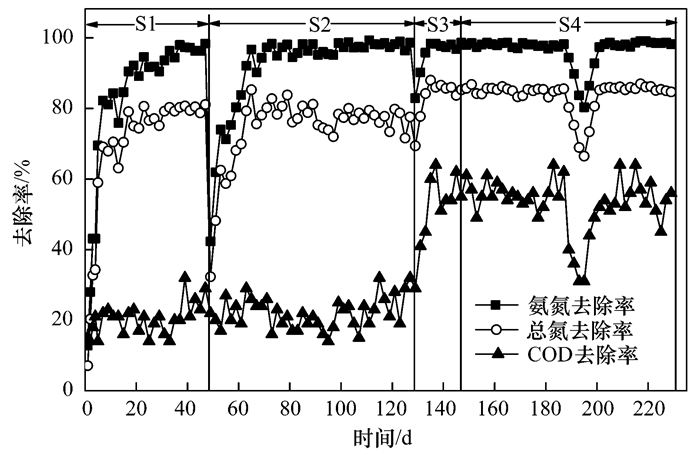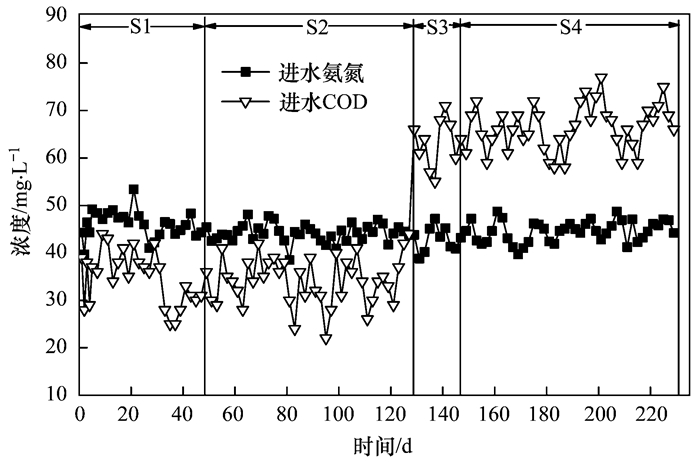 本試驗啟動分為4個階段:S1(1~48 d)為CANON工藝啟動階段; S2(49~128 d)為CANON工藝高負荷運行階段, 通過逐步縮小水力停留時間來實現CANON生物濾柱的高負荷穩定運行; S3(129~147 d)為在成功啟動CANON工藝的基礎上, 通過投加有機碳源, 實現SNAD生物濾柱的啟動; S4(148~229 d)為SNAD生物濾柱穩定運行階段, 在A/O除磷工藝出水中添加有機碳源實現SNAD生物濾柱的長期穩定運行.反應器各階段運行參數如表 2所示.