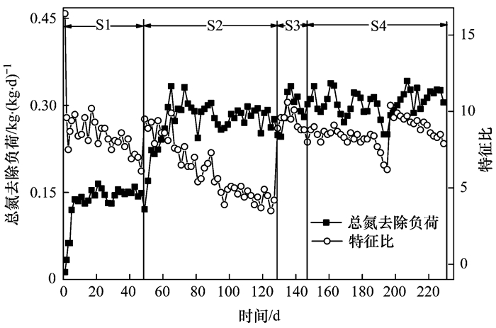 圖 5 總氮去除負荷及特征比反應器啟動初期, 特征比為16.4, 可能是由于接種的污泥由于環境的改變導致一部分細菌死亡, 為反硝化菌提供碳源, 反硝化菌活性較高.隨著碳源被消耗, 反硝化菌活性降低, 特征比逐漸下降并保持在8左右, 特征比沒有持續減小, NOB活性被維持在較低水平.