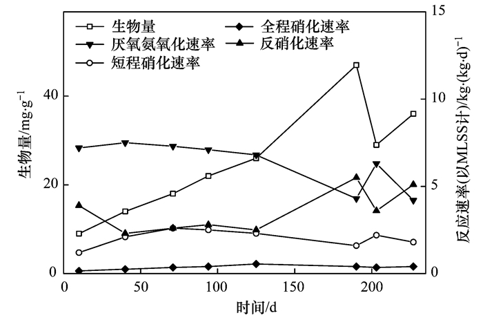 圖 6 生物量及反應速率微生物反應速率可以反映出反應器中各個種類微生物的生長情況, 單位(以N/MLSS計, 下同)kg·(kg·d)-1.由圖 6可以看出, 在CANON工藝啟動階段, 短程硝化速率保持在2~2.6 kg·(kg·d)-1左右, 說明亞硝化菌對A/O除磷出水適應良好, 生活污水的低氨氮濃度對其沒有較大影響.加入有機碳源后, 短程硝化速率下降至1.6 kg·(kg·d)-1, 隨后對反應器進行反沖洗, 短程硝化速率恢復至2.2 kg·(kg·d)-1, 反沖洗對亞硝化菌影響較小.