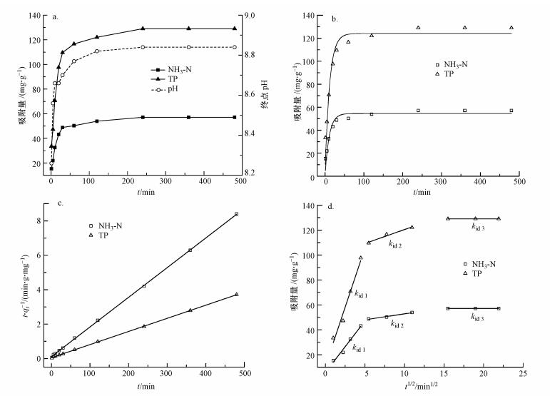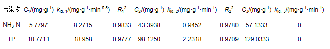 2) Mg(OH)2-BC對NH3-N和TP的吸附過程符合準二級動力學模型, 吸附受化學吸附控制, 限制反應速率的因素主要是吸附劑表面活性位點的數量.