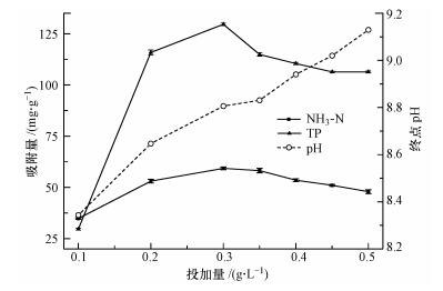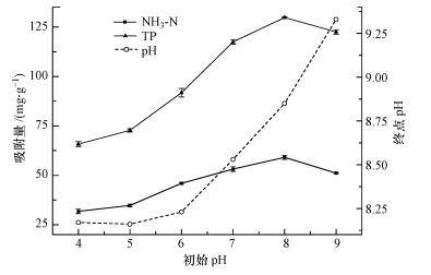 溶液pH值對鳥糞石結晶沉淀的速率、鳥糞石產量及產物的形態、結構、種類等有極大影響(Rl et al., 2003).從圖 3中可以看出, 改性材料對NH3-N、TP的吸附量先隨溶液初始pH的增加而增大, 在初始pH為8時達到最大值, 此時改性材料對NH3-N、TP的吸附量可分別達到58.3、130.0 mg·g-1, 此時溶液的終點pH接近于9.當溶液的初始pH值大于8時, 其終點pH隨之升高, 改性材料對NH3-N、TP的吸附量都下降.這說明Mg(OH)2-BC吸附NH3-N、TP的最佳反應pH在9左右, 這與Buchanan等(1994)及楊明珍等(2011)的結論一致.值得注意的是, 即使溶液的初始pH很低, 其終點pH也一直穩定在8.0以上.這說明改性材料Mg(OH)2-BC是一種自堿性很強的材料, 對廢水的pH有較強的調節作用.