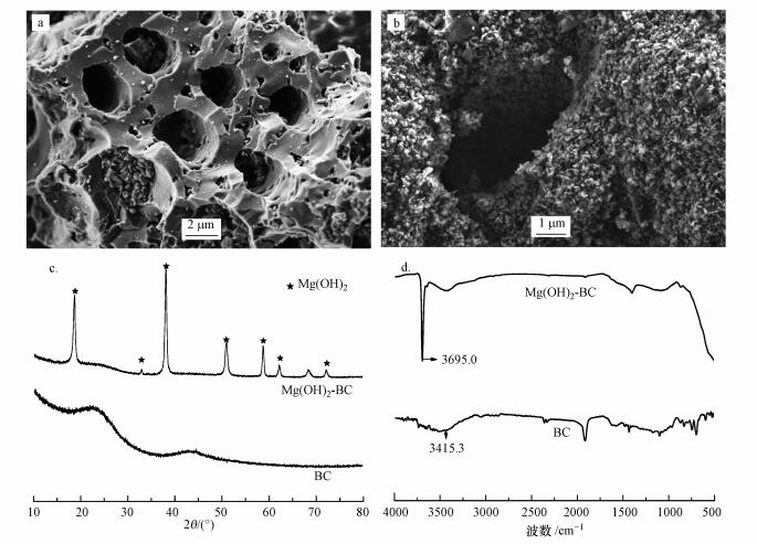 圖 1原材料(BC)(a)和改性材料(Mg(OH)2-BC)(b)的SEM圖及XRD圖譜(c)和FTIR圖譜(d)