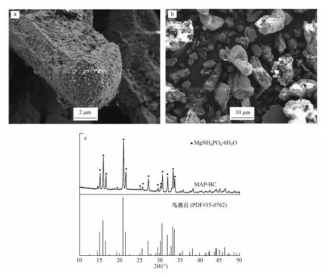 為了更好地分析Mg(OH)2-BC固定氮、磷的機理, 本文拍攝了在最優條件下(溶液初始pH=8, 投加量0.3 g·L-1)Mg(OH)2-BC回收氮、磷后的反應產物MAP-BC的電鏡圖像, 并分析了回收產物的XRD衍射圖譜.從圖 5a及5b中可以看出, 改性材料表面上附著的納米片狀Mg(OH)2基本消失, 產物中可見有六棱柱狀的鳥糞石結晶生成并附著在生物質炭上.由圖 5c可知, 與鳥糞石標準XRD譜圖(PDF#15-0762)對比, 二者特征衍射峰的位置具有高度的一致性, 在2θ為14.99°(110)、15.81°(020)、16.47°(011)、20.85°(111)、21.45°(021)、25.61°(200)、27.09°(130)、30.60°(211)、31.91°(040)、33.28°(022)、33.67°(221)處出現的多個強衍射峰, 都表明Mg(OH)2-BC上負載的Mg(OH)2晶體與模擬廢水中的NH3-N、TP結合生成了鳥糞石結晶, 該改性材料固定廢水氮、磷的主要機理為鳥糞石結晶沉淀.