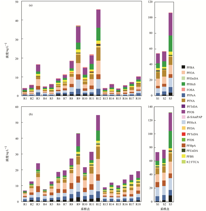 河流水樣中, 氧化前15種PFAAs及其3種前體物的總質(zhì)量濃度范圍為3.93~45.70 ng·L-1, 均值為13.02 ng·L-1; 其中質(zhì)量濃度較高的為PFOS、PFOA、PFHxS和PFNA, 其值分別為0.66~9.65、0.68~7.31、0.57~6.79和0.35~6.94 ng·L-1; 其均值分別為2.59、2.13、1.56和1.49 ng·L-1(表 1).河流18個采樣點(diǎn)的總濃度具有明顯的空間差異, 每一條河流下游濃度明顯高于上游(圖 2), 其原因可能是河流上游的采樣點(diǎn)主要位于農(nóng)村地區(qū), 周圍沒有工業(yè)污染物的排放和影響, 所以PFAAs的濃度較低; 如R1點(diǎn)為城市飲用水源地, 沒有任何污染物排放, 所以其濃度很低; 河流下游采樣點(diǎn)位于城區(qū)和工業(yè)區(qū)附近, 受周圍工業(yè)廢水和生活污水排放的影響, 所以PFAAs的濃度較高.另外, 本文選取的三座污水處理廠, 其出水全部排入到附近河道中, 對河流污染物的含量可能有重要影響; 如R12點(diǎn)就是各項(xiàng)來水的匯集點(diǎn), 該點(diǎn)ΣPFAAs值最高.所以, 河流上下游接納污染物數(shù)量的不同可能是導(dǎo)致河流不同采樣點(diǎn)PFAAs濃度空間差異的重要原因.此外, 人口密度、區(qū)域工業(yè)發(fā)展程度及居民生活水平也可能影響附近水環(huán)境中全氟化合物的濃度.具體聯(lián)系污水寶或參見http://m.bnynw.com更多相關(guān)技術(shù)文檔。
