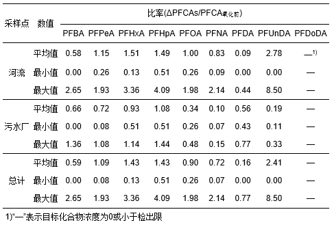 本文通過對PFCAs質(zhì)量濃度的增加量(ΔPFCAs)與氧化前PFCAs化合物(PFCA氧化前)的質(zhì)量濃度之比(ΔPFCAs/PFCA氧化前)進(jìn)行了分析, 揭示了PFAAs前體物的轉(zhuǎn)化特征(圖 3和表 3).在河流水體樣品中, 比值較高化合物為PFUnDA(0.00~8.50, 平均為2.78)、PFHxA(0.13~3.36, 平均為1.51)、PFHpA(0.51~4.09, 平均為1.49);在污水廠出水中, 比值較高的化合物為PFHpA(0.51~1.44, 平均為1.08)、PFHpA(0.51~1.14, 平均為0.93)、PFPeA(0.08~1.08, 平均為0.72);所以, 此比值在不同水體中存在明顯差異.此外, 污水廠出水的ΔPFCAs要遠(yuǎn)高于在河流水體, 而污水廠出水ΔPFCAs/PFCA氧化前值卻明顯低于河流水樣的值.污水廠出水中ΔPFCAs較高, 而比值較低, 這可能由于污水處理過程中前體物的降解所致.