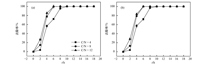 水體中的硝酸鹽不僅能夠通過反硝化作用從水體中脫除, 還可以通過微生物同化作用轉(zhuǎn)化為自身生物量, 或者經(jīng)異化還原作用重新以銨根離子的形式釋放到水體中.因此僅憑硝酸鹽濃度的減少不能判斷為反硝化脫氮, 還需與水體中總氮的去除效果進(jìn)行比較.如圖 3, 在C/N為8和12時(shí), N3在8 h即可實(shí)現(xiàn)總氮的完全去除; 當(dāng)C/N=4時(shí), 14 h亦可實(shí)現(xiàn)90%的總氮去除率.這與水體中硝酸鹽的去除效果基本一致, 表明N3主要通過反硝化作用完成整個(gè)脫氮過程.