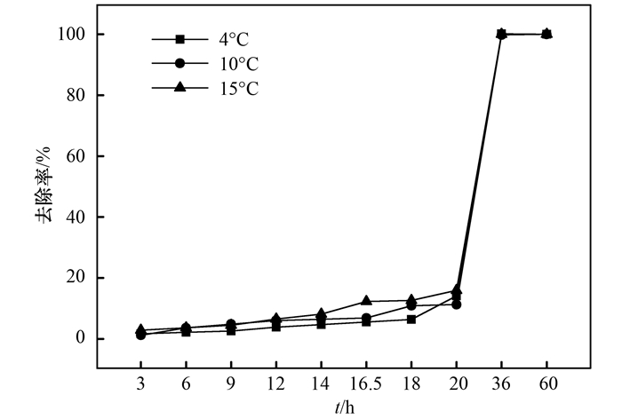 低溫對(duì)酶的活性有強(qiáng)烈的抑制作用, 進(jìn)而影響微生物的生長和代謝, 導(dǎo)致反硝化細(xì)菌冬季脫氮效果不理想[2].如圖 7所示, 在剛開始的20 h, N3對(duì)低溫有一個(gè)適應(yīng)期, 硝酸鹽去除表現(xiàn)出延滯作用.隨后去除率迅速增加, 最終在36 h內(nèi)實(shí)現(xiàn)對(duì)硝酸鹽的完全去除.冬季人工濕地水力停留時(shí)間一般在2~10 d, 良好的低溫適應(yīng)性使得N3成為冬季人工濕地中反硝化脫氮的候選菌株, 具有良好的應(yīng)用前景.