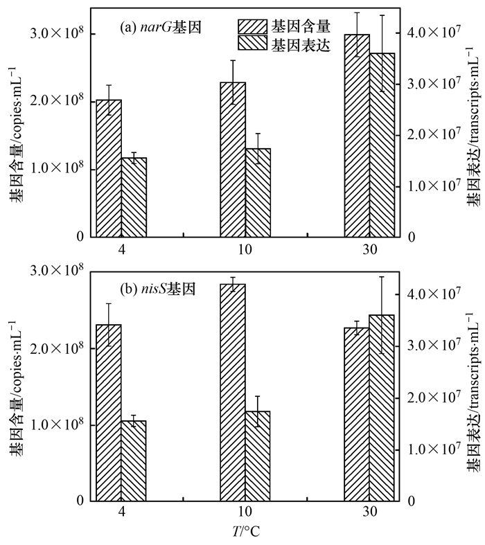 采用定量PCR技術(shù)對(duì)反硝化基因narG、nirS在4、10與30℃條件下的表達(dá)進(jìn)行檢測(cè), 結(jié)果如圖 8所示.在各溫度下, narG的基因豐度在2.03×108~2.99×108 copies·mL-1之間, nirS的基因含量在2.27×108~2.83×108 copies·mL-1之間, 各溫度之間相差不大.而對(duì)于基因表達(dá)來說, 4℃和10℃下, narG的表達(dá)量在1.74×107~1.95×107 transcripts·mL-1菌液之間, nirS的表達(dá)量在1.56×107~1.74×107 transcripts·mL-1菌液之間, 為30℃下表達(dá)量的1/3~1/2.低溫通過抑制反硝化基因的表達(dá)影響菌的生長和酶的活性, 進(jìn)而導(dǎo)致反硝化速率的下降, 但是反硝化能力的高低還可能與mRNA的壽命及蛋白質(zhì)的活性等有關(guān), 需要進(jìn)一步地研究進(jìn)行驗(yàn)證.