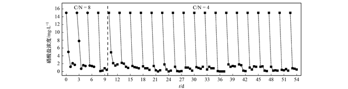 硝酸鹽是污水處理廠尾水中氮的主要形式, 15 mg·L-1的總氮含量能夠滿足城鎮(zhèn)污水處理廠污染物排放的一級(jí)A標(biāo)準(zhǔn), 但仍遠(yuǎn)超2 mg·L-1的地表水環(huán)境V類水標(biāo)準(zhǔn).硝酸鹽的積累導(dǎo)致水體富營養(yǎng)化, 對(duì)環(huán)境造成極大的危害.另外, 飲用水中硝酸鹽含量過高還可能會(huì)引發(fā)癌癥, 危害人體健康.因此, 對(duì)低濃度硝酸鹽水體的深度處理也日益受到重視.