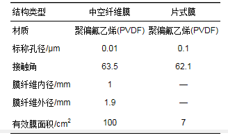 本實驗所用PVDF中空纖維超濾膜膜絲, 在杭州衛(wèi)士環(huán)保科技有限公司購買, 超濾膜組件自制而成; PVDF片式膜, 膜購自默克密理博公司, 剪裁為直徑3 cm與針孔過濾器進行組裝, 制成膜組件進行過濾實驗, 具體參數(shù)見表 2.