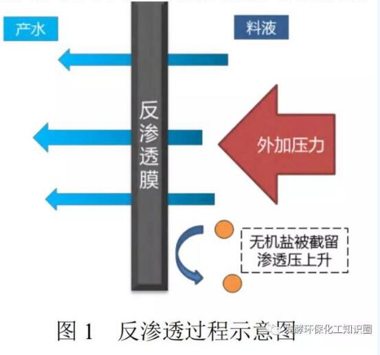 反滲透是以壓力差為推動(dòng)力,從溶液中分離出溶劑的膜分離過(guò)程。如圖1所示,對(duì)料液側(cè)施加壓力,當(dāng)壓力超過(guò)膜兩側(cè)的滲透壓差時(shí),溶劑會(huì)逆著自然滲透的方向反向滲透,溶質(zhì)被反滲透膜攔截。最終在膜的低壓側(cè)得到透過(guò)的溶劑,即產(chǎn)水;高壓側(cè)得到濃縮的溶液,即濃水。反滲透技術(shù)是一項(xiàng)成熟的脫鹽技術(shù),目前廣泛應(yīng)用于飲用水深度處理、工業(yè)廢水回用、苦咸水脫鹽、海水淡化等水處理領(lǐng)域。