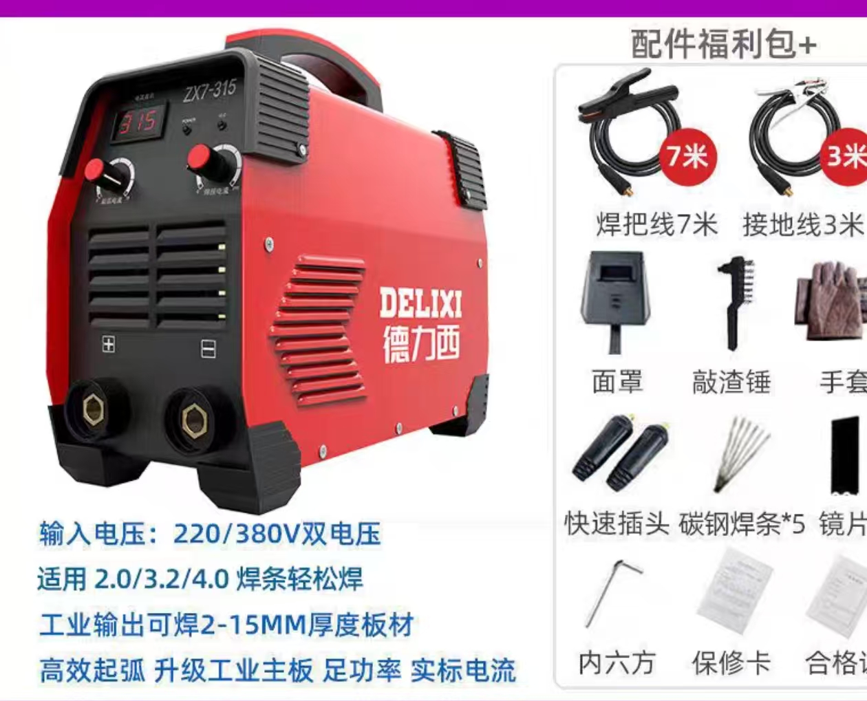 物料描述輸入電壓220/380V,雙電壓,適用2.0/3.2/4.0焊條。配焊把線7米,接地線3米