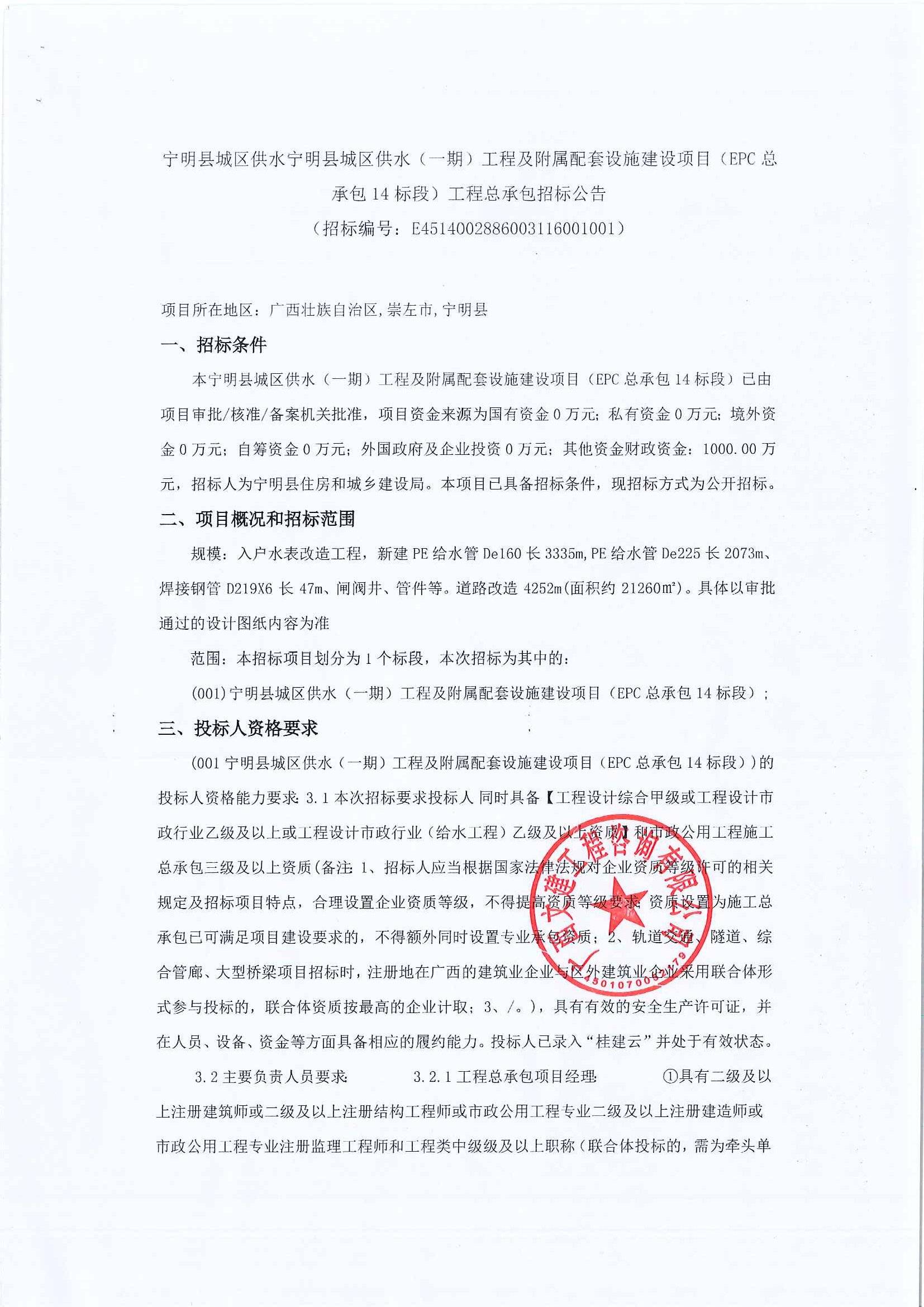 廣西寧明縣城區(qū)供水寧明縣城區(qū)供水(一期)工程及附屬配套設(shè)施建設(shè)項目(EPC總承包14標(biāo)...