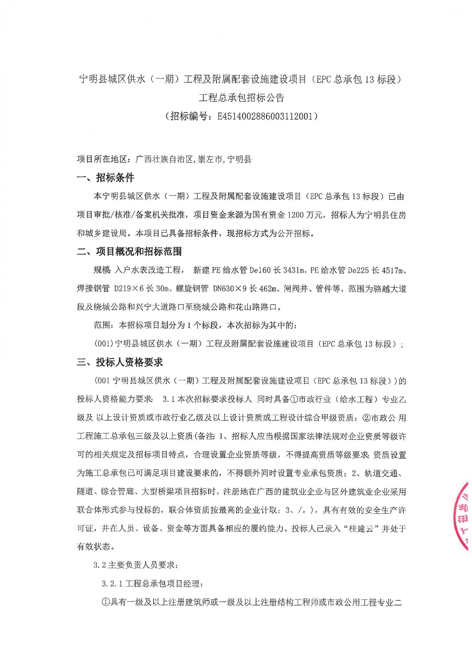 廣西寧明縣城區供水(一期)工程及附屬配套設施建設項目(EPC總承包13標段)工程總承包...