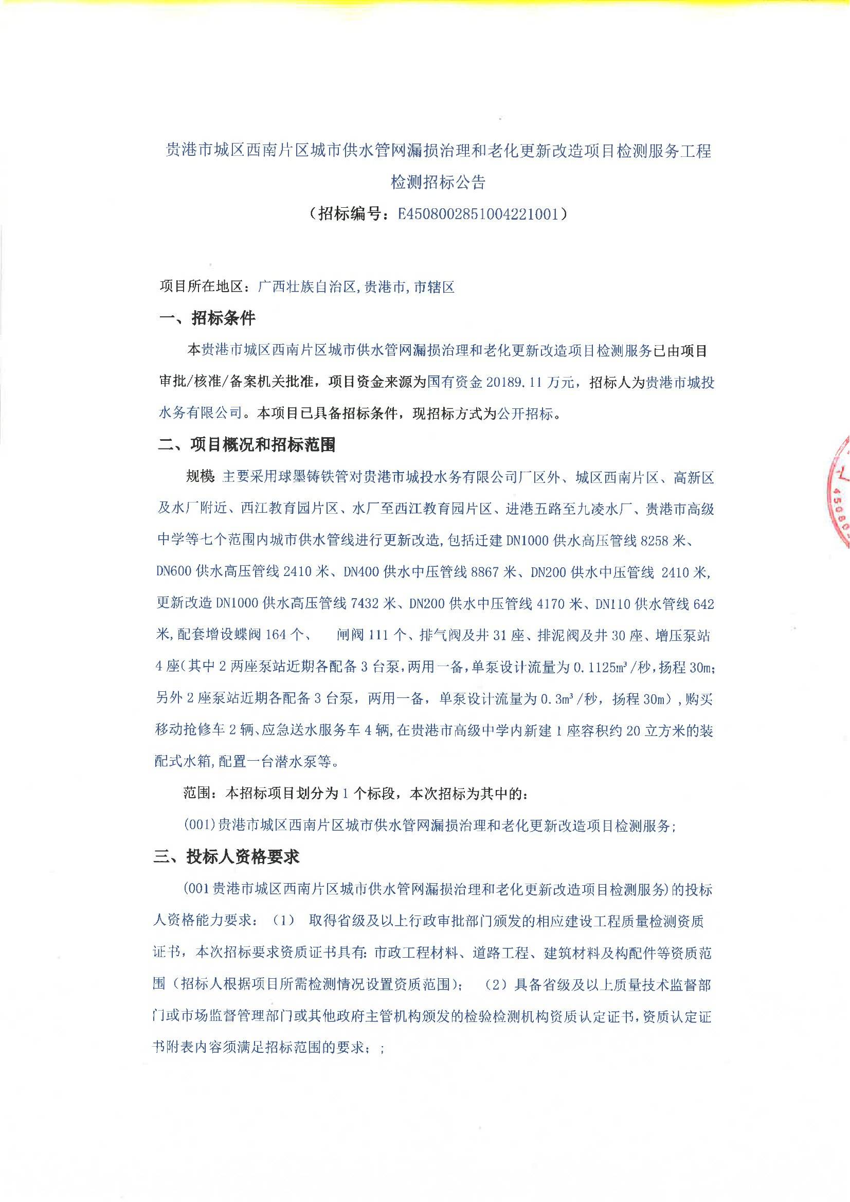 廣西貴港市城區西南片區城市供水管網漏損治理和老化更新改造項目檢測服務工程檢測招標公告