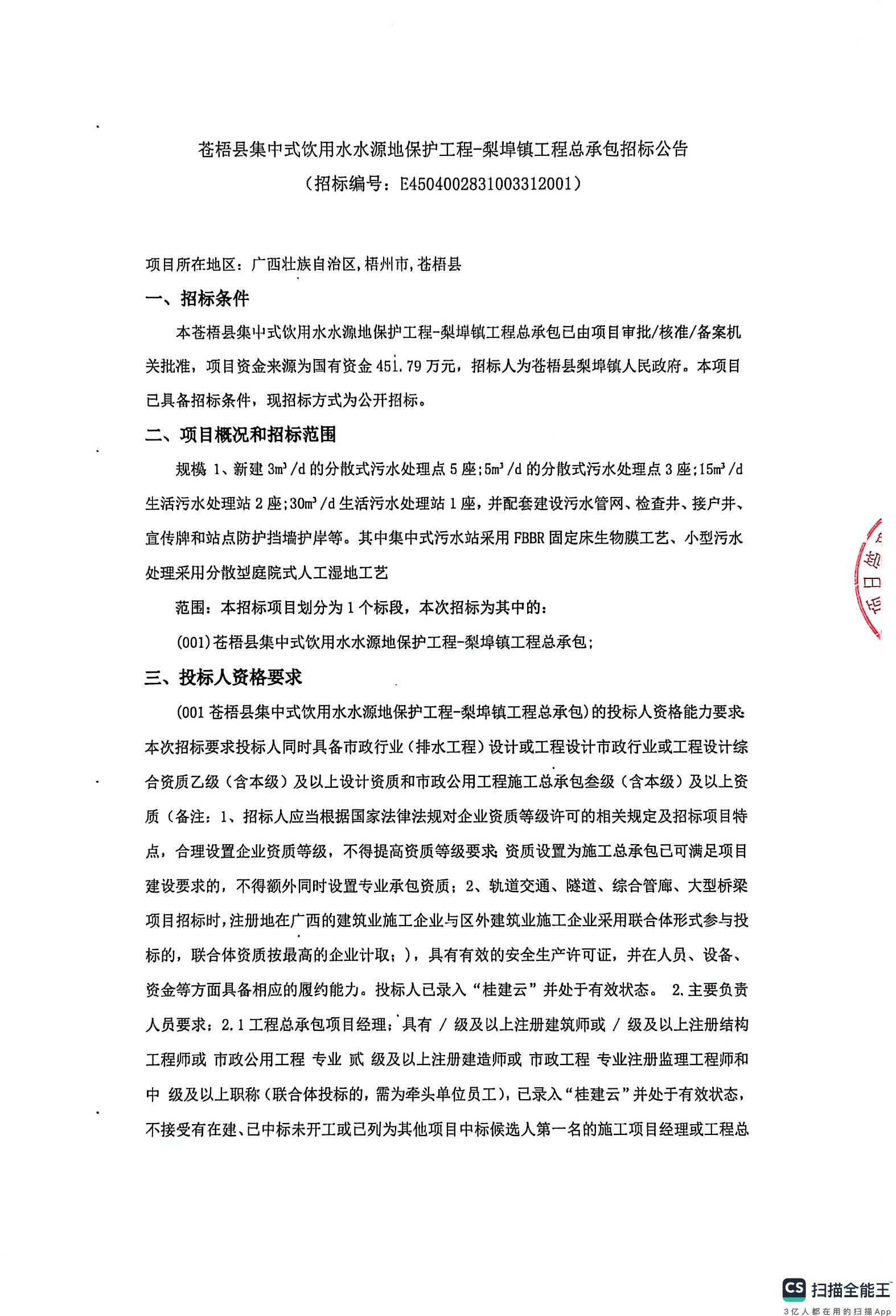 廣西蒼梧縣集中式飲用水水源地保護工程-梨埠鎮工程總承包招標公告