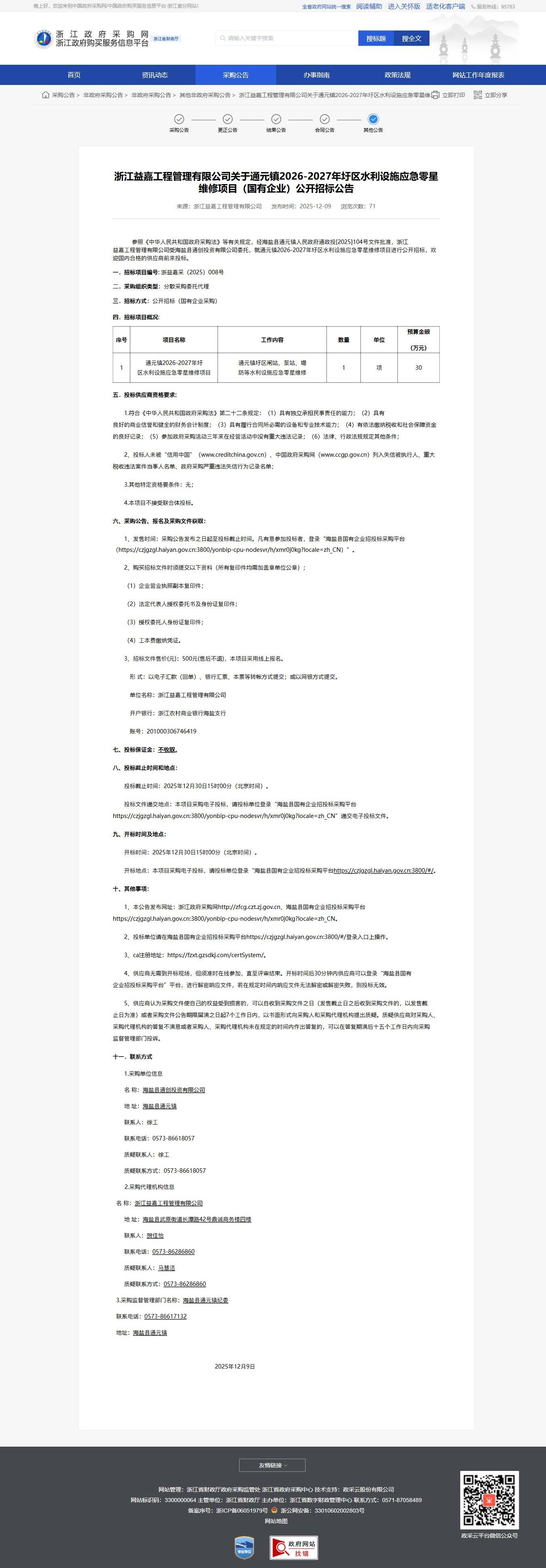 浙江益嘉工程管理有限公司關于通元鎮2026-2027年圩區水利設施應急零星維修項目〈國有企業)公開招標公告